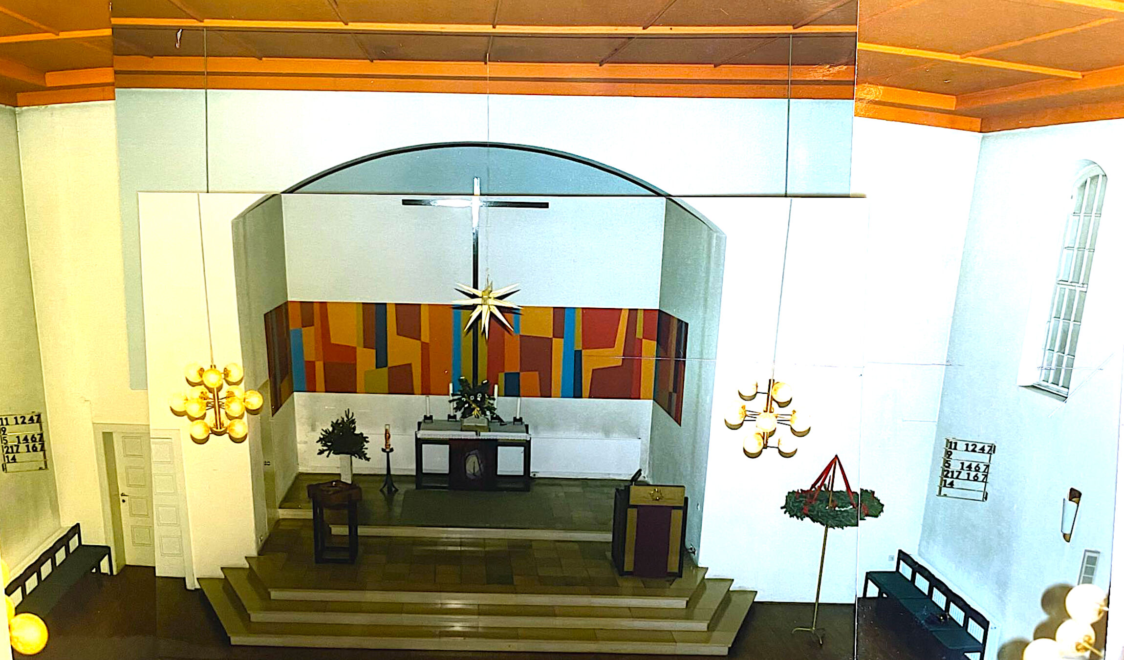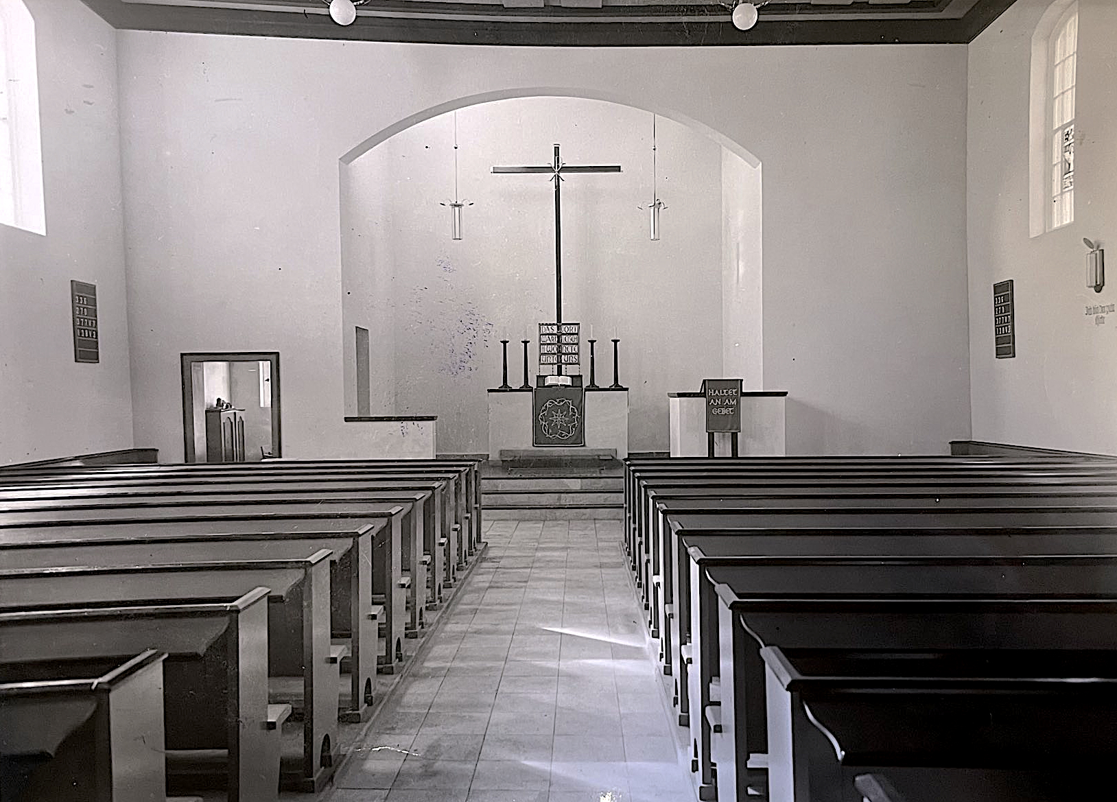 Das große Kreuz, wie es heute noch im Altarraum zu sehen ist, war von Beginn an der Blickpunkt der nach Westen ausgerichteten Kirche. Zentral im Treffpunkt von Längs- und Querbalken befand sich das Christusmonogramm (die beiden griechischen Buchstaben Chi-Ro als Anfangsbuchstaben für Christus). Lesepult, Altar und Kanzel waren im Altarraum fest eingebaut und mit einer Mauer abgetrennt.